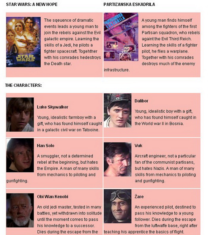 Кога малку ќе се погледне под површината, не станува збор само за холивудскиот зачетник на приказната за "силата" и култниот партизански филм од стара Југославија. Слични се и многу ликови, пред се Лук Скајвокер и Далибор, како и Дарт Вејдер и Клауберг.
