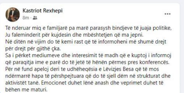 „Почитувани пријатели и семејство, без разлика на вашите политички убедувања. Ви благодарам за грижата и поддршката што ми ја давате. Следниве денови ќе имаме можност подиректно да се информираме за сѐ. Во однос на медиумите и интересот ги разбирам и ги информирам дека мојот прв настап ќе биде во понеделник преку прес-конференција. На крајот апелирам до раководството на Движењето БЕСА да не презема забрзани чекори кои ќе им наштетат на нашите структури и активисти. Треба да се постапува внимателно“, напиша Реџепи на неговиот приватен профил на социјалната мрежа.