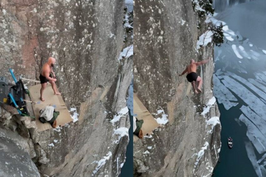 Кен го соборил светскиот рекорд за највисок смртоносен скок, скокајќи во заледено море од висина од 40,5 метри. На снимката се гледа како тој прво фрла камен во морето, а потоа набрзо и самиот скокнува од карпата со раширени раце, со стомакот свртен кон морето токму како што налагаат правилата на оваа опасна дисциплина.