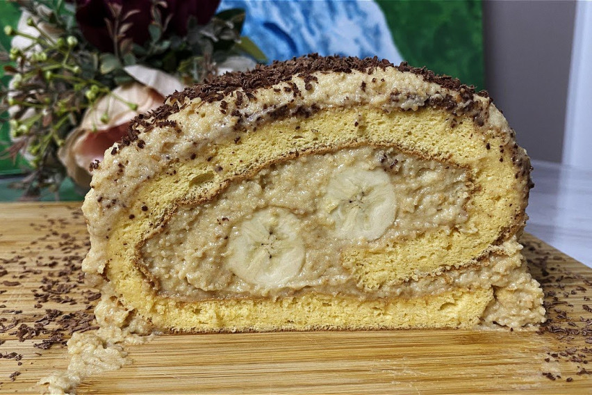 Над кората ставете го филот, па на средина бананите и замотајте ролат. Остатокот од филот ставете го над ролатот, а може да додадете и шлаг или рендано чоколадо.