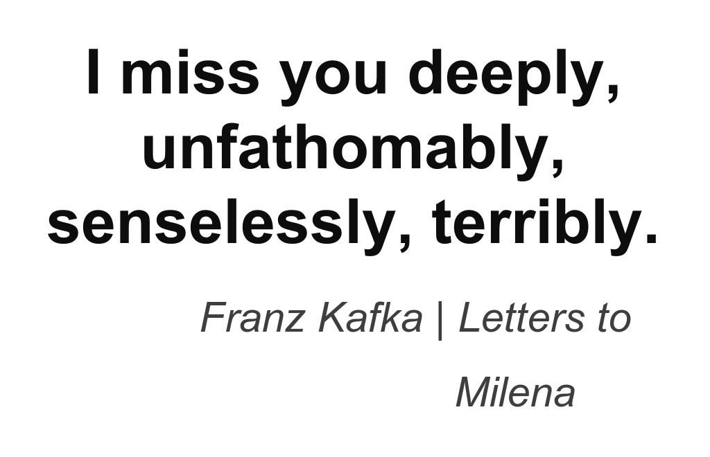 Кафка им пишувал и на своите вереници, но овие писма ги достигнуваат поетските височини на неговото трогателно обраќање до Милена. Нивната врска била интелектуална, не помрачена од заканувачката сенка на иден (неуспешен) брак. Можеби ова е причината за неограничената размена на наклонетост. Милена била мажена за друг. Кафка бил венчан со книжевноста.