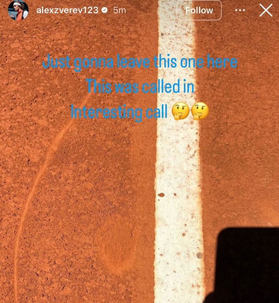 Поради една сомнителна топка, Зверев бараше од главниот судија да се симне на теренот и да ја провери трагата од топчето, но бидејќи веќе некое време се користи „соколово око“ во замена за линиски судии, одлуката не може да се менува.