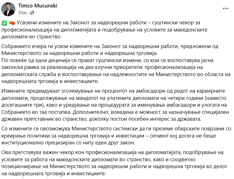 Министерот за надворешни работи и надворешна трговија, Тимчо Муцунски, преку социјалните мрежи информираше дека вчера Собранието, на предлог на Министерството за надворешни работи и надворешна трговија, ги усвои измените на Законот за надворешни работи, што претставува суштински чекор за професионализација на дипломатијата и подобрување на условите за македонските дипломати во странство.
