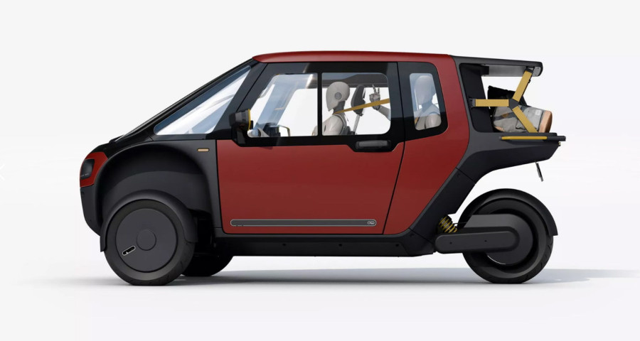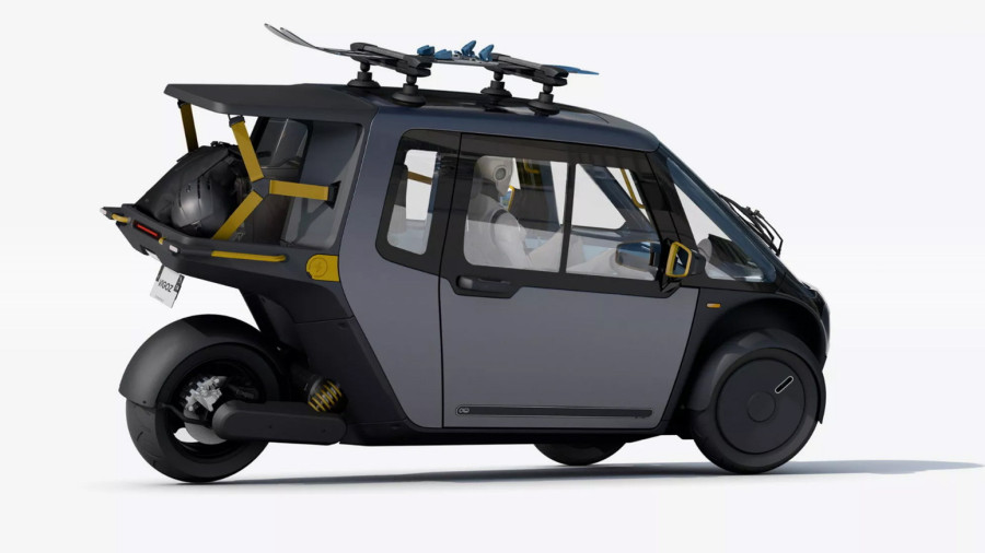 Возилото има две предни и едно задно тркало, активен систем за навалување во кривини, затворена кабина со брисачи, LED светла и простор за товар.