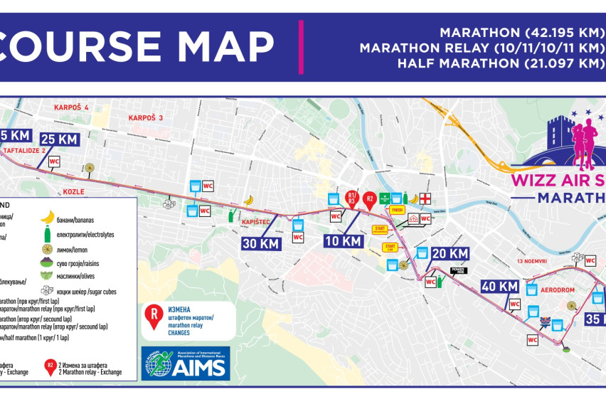 Патеката за маратонската трка, полумаратонот и штафетната трка, ќе стартува на улицата „11 Октомври“ пред Собранието и тргнува во правец кон запад по улица „Митрополит Теодосиј Гологанов“. Тркачите ќе трчаат право во двете насоки до крај на овој булевар и продолжуваат право по ул. „Васил Чакаларов“, каде по семафорите во населба Хром, ќе свртат полукружно и ќе се вратат во правец кон центар по истите улици и булевари. Кога ќе се враќаат тркачите кај Собрание, ја продолжуваат трасата по улица „11 Октомври“ кон Црвен Крст и ќе свртат кај Тутунски комбинат лево на бул. „Крушевска Република“ и десно на „Трета Македонска Бригада“. По неа ќе се трча до раскрсницата кај Американ Колеџ и ќе се врти лево по улица „Васко Карангелески“. Потоа ќе трчаат право сѐ до раскрсницата со бул. „Јане Сандански“. На раскрсницата ќе се врти десно и ќе се трча сѐ до раскрсницата со Бул. „Србија“, каде, пред неа се врти полукружно во истата коловозна страна (другата страна од булеварот е слободна за сообраќај во правец кон Центар) и ќе трчаат до пред раскрсницата кај Тобако 2. Тркачите полукружно ќе се враќаат до раскрсницата кај Сансет, ул. „Васко Карангелески“, десно до крај и повторно десно ќе излезат на „Трета Македонска Бригада“. Трчаат по истата патека до Собрание, со тоа што полумаратонците финишираат на Плоштад Македонија, а маратонците трчаат уште еден круг.