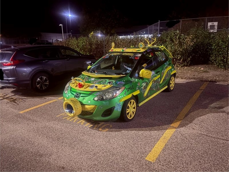 Дали оваа околу петнаесет години стара „Mazda 2“ побегнала од новите „Transformers“, се подготвува за претстојниот „Halloween“ или станува збор за уметничко дело на неразбран уметник? Веројатно никогаш нема да дознаеме.