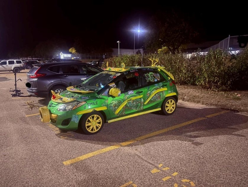 Кога некој ќе каже дека „автомобилот мора да има карактер“, таа изјава може да се протолкува на различни начини. Но сопственикот на зелениот „змеј“, снимен неодамна на едно паркиралиште, ја сфатил буквално. Опремена со рогови, жолти тркала, бројни „украсни“ детали и дополнителни гуми поставени напред и назад, неговата (или нејзината) мала „Mazda“ успева истовремено да ги насмее и да ги исплаши минувачите.