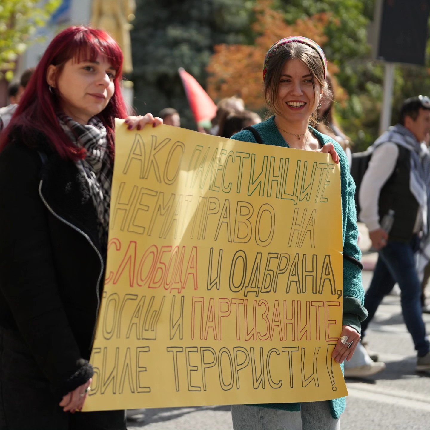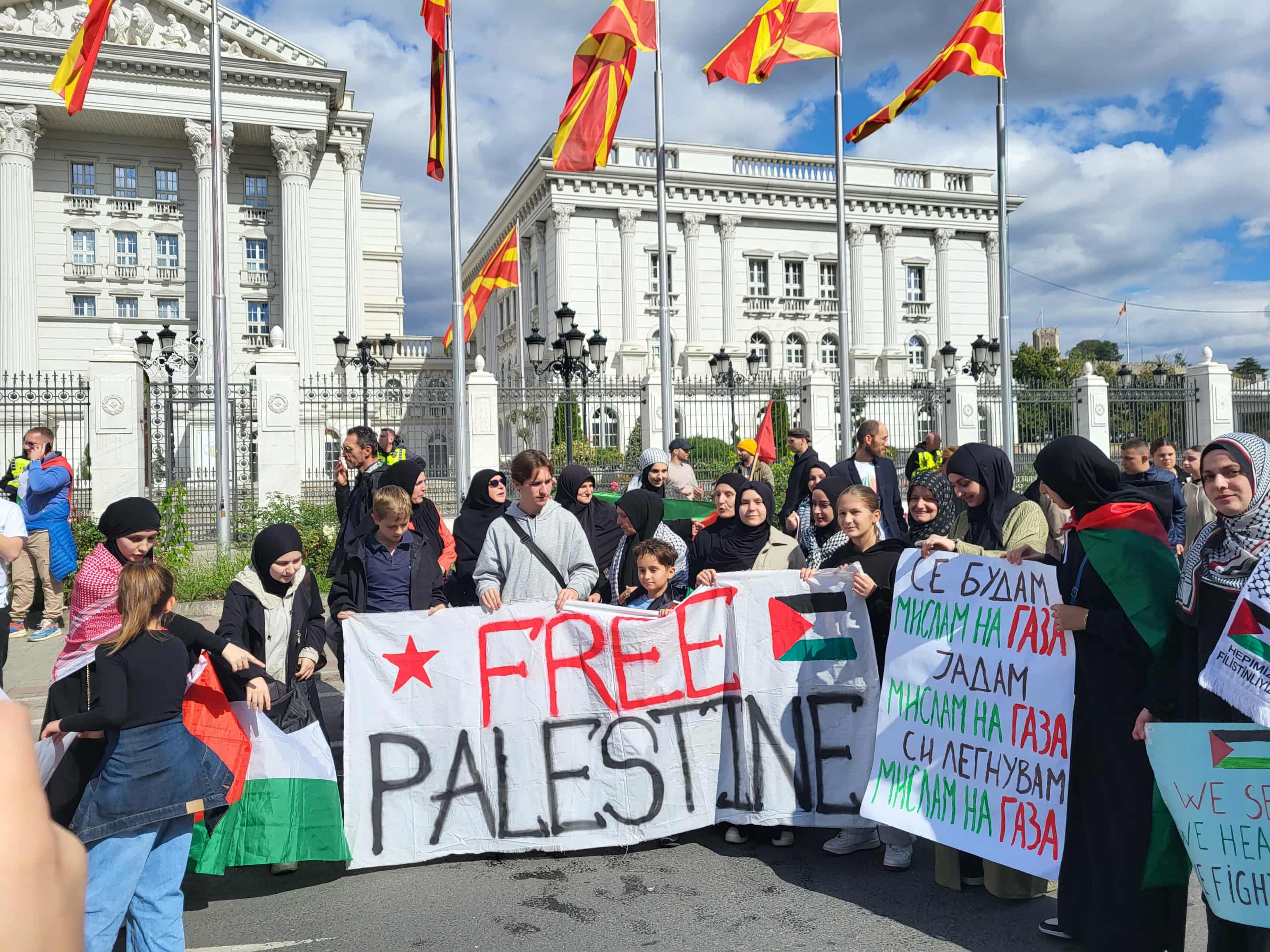 „Нивната мака е огледало на нашата македонска мака. Нивната борба за парче сопствена земја е истата борба што нашите дедовци ја воделе, а ние и денес ја продолжуваме,“ порача еден од говорниците на протестот. „Како што Македонија беше распарчена по војните, така и Палестина денес е окупирана и поделена. Болката на палестинската мајка е иста со болката на нашите баби прогонети од Егеј.“