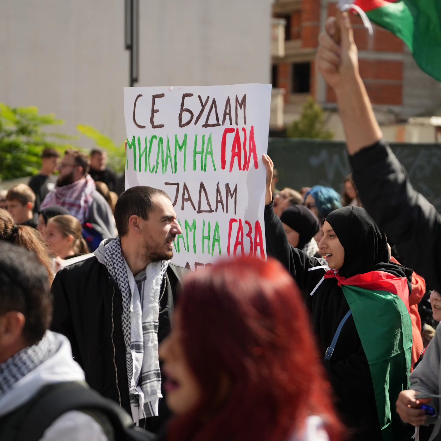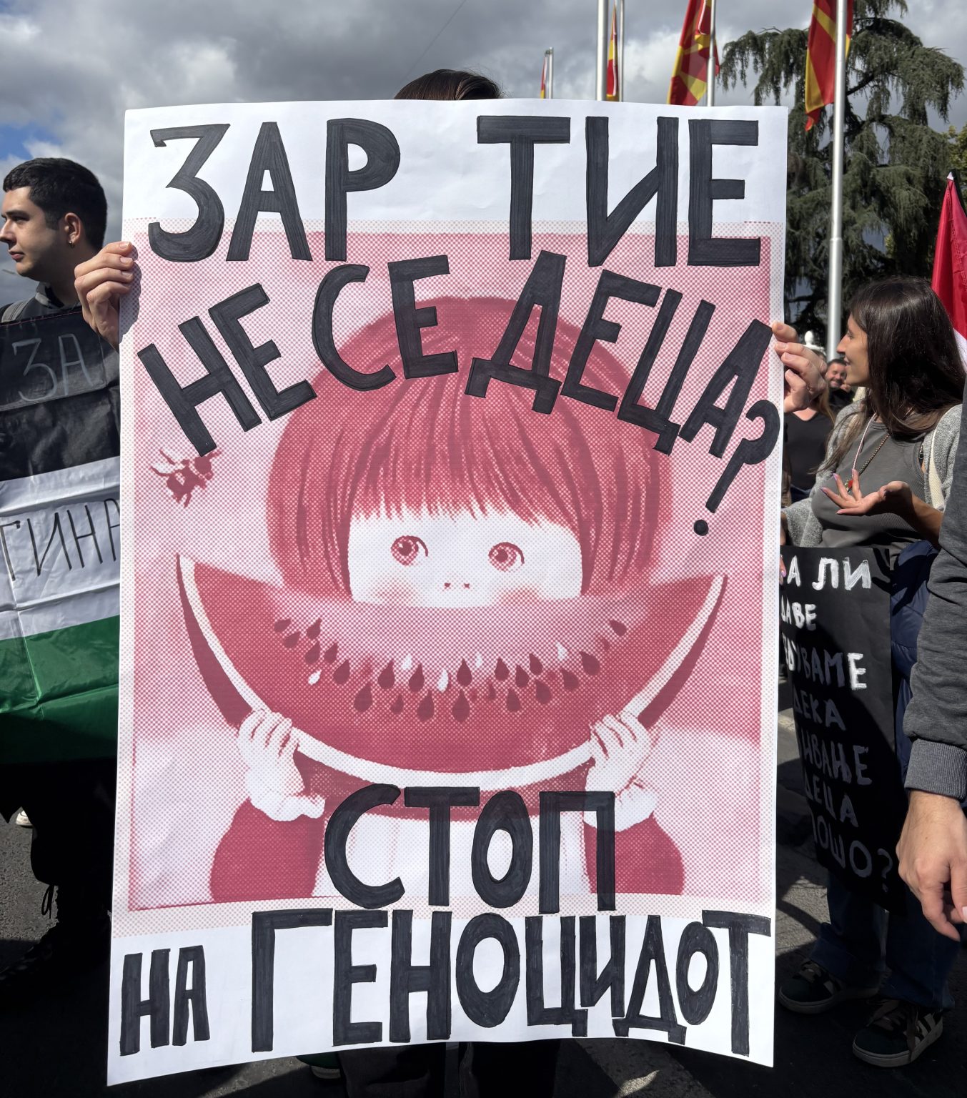 „Веќе две години нашите влади го срамат угледот на Македонија на меѓународно ниво. Наместо независна и принципиелна политика, гледаме пасивност и усогласување со туѓи интереси. Македонија денес избира да го сврти погледот од геноцидот, и тоа е политичка одлука, не неутралност,“ рече еден од претставниците на иницијативата „Сите за Палестина“.