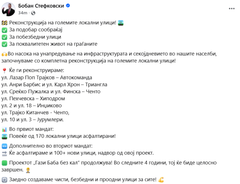 Актуелниот градоначалник на Гази Баба и кандидат на локалните избори од ВМРО-ДПМНЕ, Бобан Стефковски преку социјалните мрежи најави реконструкција на големите локални улици, за подобар сообраќај, побезбедни улици, за поквалитетен живот на граѓаните.