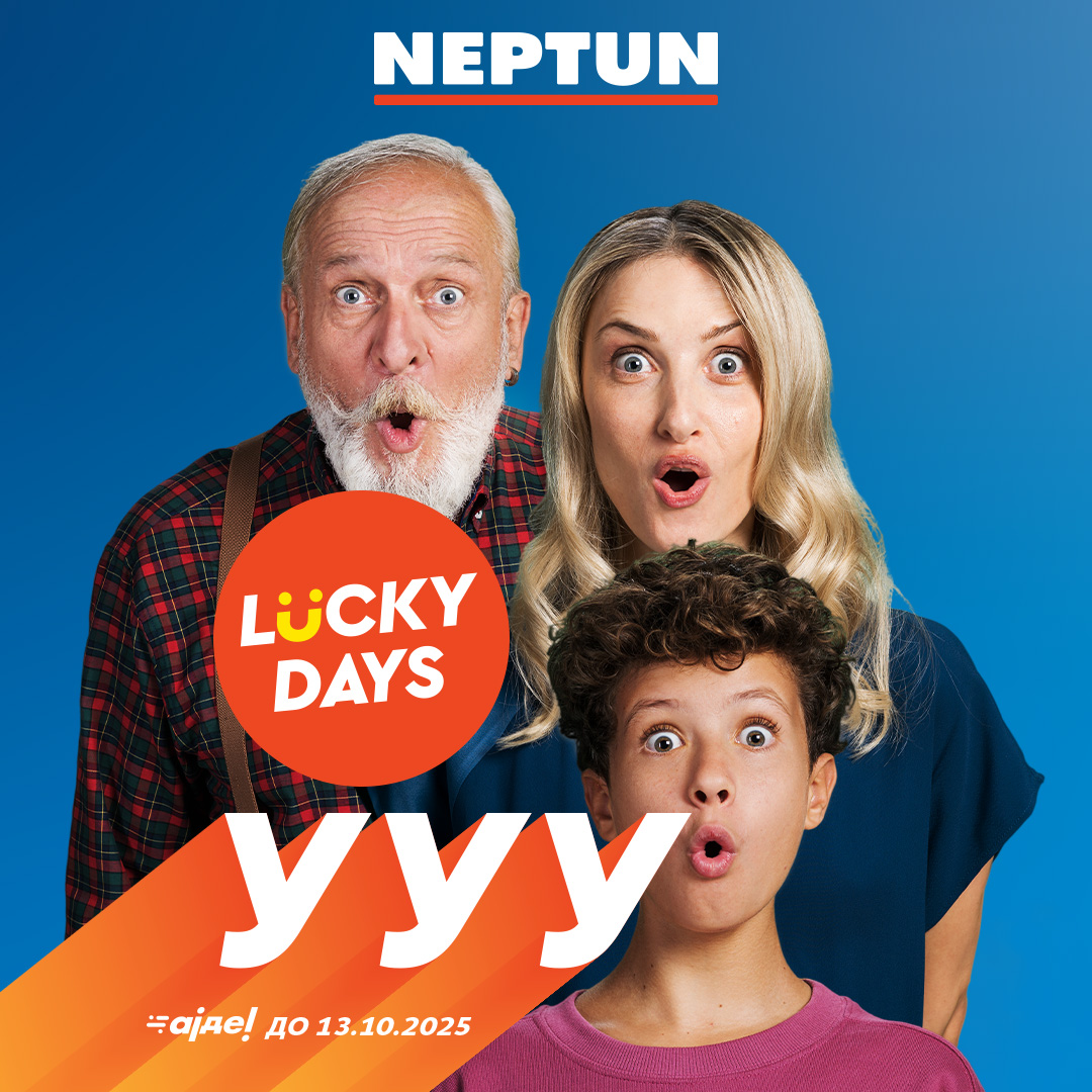 Од 08.10.2025 започнуваат Lucky Days во НЕПТУН денови исполнети со огромни попусти, неверојатни заштеди и најиновативни решенија за вашиот дом! Ова е времето кога купувањето станува вистинско искуство – со врвен тим подготвен да ви помогне да го најдете уредот што најмногу ви одговара, со јасна споредба, демонстрација и професионален совет.