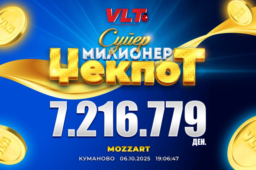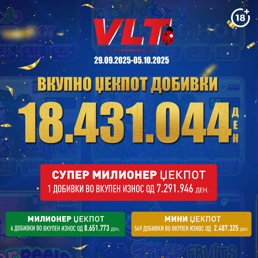 Во периодот од 29.09.2025 до 05.10.2025 Видеолотарија Касинос Австрија исплати фантастични 18.431.044 денари кон играчите на ВЛТ терминалите ширум Македонија и тоа: