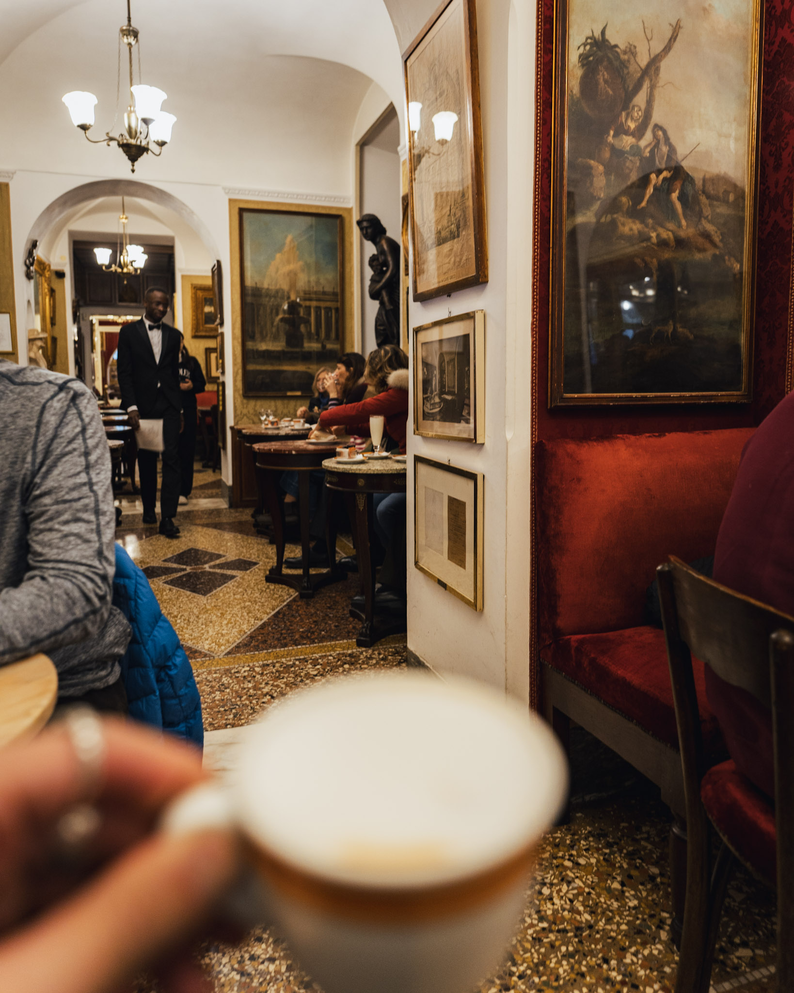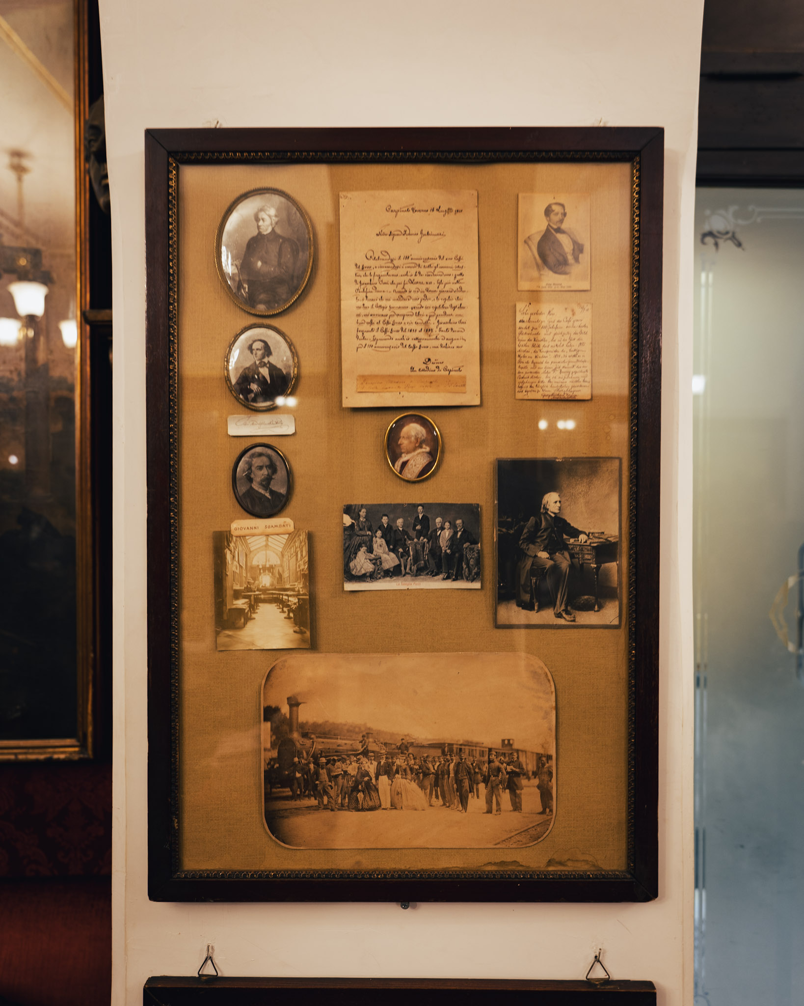 Покрај тоа, во кафулето се сместени бројни сувенири и снимки од славни времиња: машната на Д’Анунцио, сонети, белешки, скици на познати гости и фотографии. Во салата Омнибус изложени се медалјони, гипсани плочи и минијатури на кои се прикажани уметници, поети и музичари кои го посетувале местото низ годините.