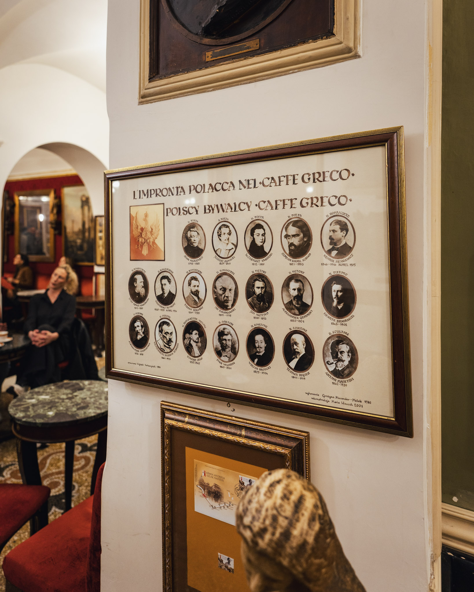 Уметничките дела во деветте соби на кафулето беа каталогизирани во 1989 година од историчарката на уметност Тамара Фелиситас Хафшмит и новинарот Ливио Јанатони, член на литературниот круг „Club dei Romanisti“ кој ги одржувал своите неделни состаноци во Кафе Греко.