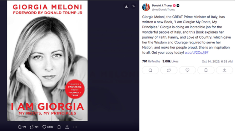 „Џорџија Мелони, големата премиерка на Италија, напиша нова книга. Џорџија работи неверојатна работа за прекрасниот народ на Италија. Таа е инспирација за сите“, напиша американскиот милијардер на својата социјална мрежа Truth Social.