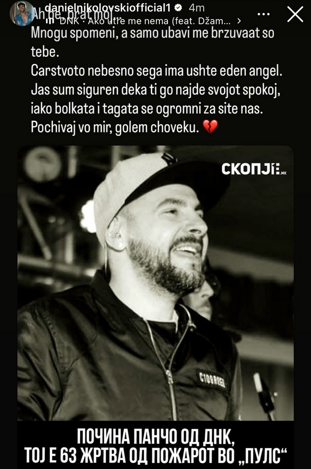 „Скокав и плачев од радост кога те слушнавме летово. Денес, огромна тага и гнев. Зошто? Те познавав кратко, но вистинска чест ми е што запознав голем човек пред сѐ. Широко небо Панчо, пеј со ангелите горе. Те сакаме“.