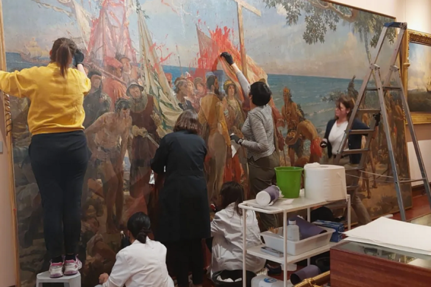 Полицијата во Шпанија обвини две активистки кои фрлиле црвена боја врз историското уметничко дело на Хозе Гарнел „Primer homenaje a Cristóbal Colón“ (Прв омаж на Кристофер Колумбо) во Поморскиот музеј во Мадрид.