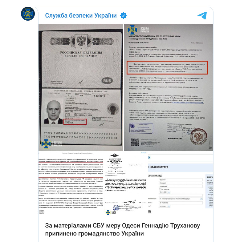 Разузнавачката служба на Украина (SBU) соопшти дека има докази дека Труханов поседува важечки руски пасош и објави фотокопија од него на Телеграм.