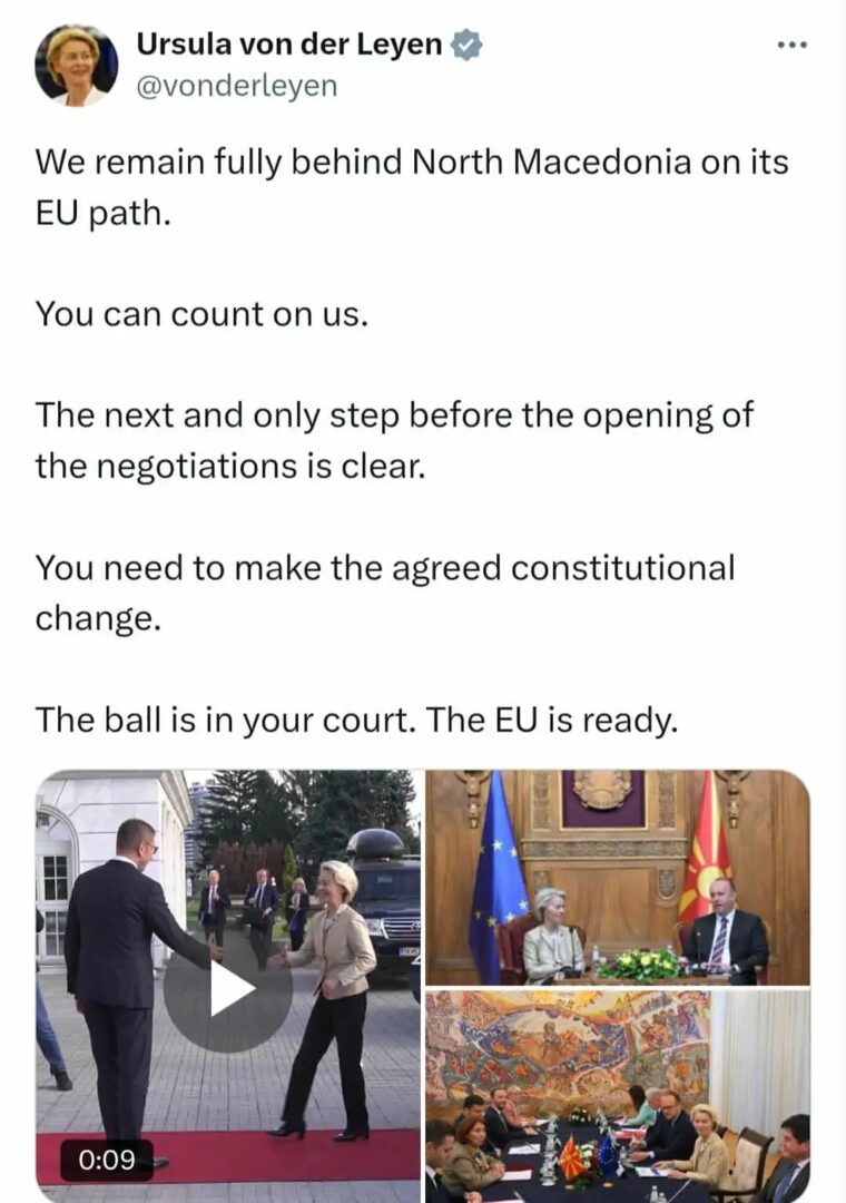 -Вашиот следен и единствен чекор пред отворањето на преговорите е јасен, а тоа е да ги направите уставните измени. Топката е во вашиот двор. ЕУ е подготвена“ напиша кусо Фон дер Лајен.