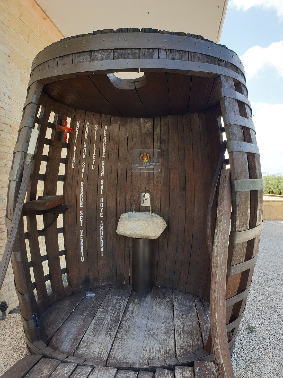 Фонтаната била поставена во 2016 година од винаријата Дора Сарчезе, со желба да им понуди на аџиите и туристите симболичен момент на релаксација и гостопримство. Оваа винска фонтана не е маркетиншки трик, туку искрен гест на добредојде во духот на древните италијански традиции.