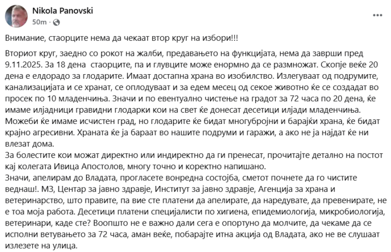 „Вториот круг, заедно со рокот на жалби, предавањето на функцијата, нема да заврши пред 9.11.2025. За 18 дена, стаорците, па и глувците, може енормно да се размножат. Скопје веќе 20 дена е елдорадо за глодачите. Имаат достапна храна во изобилство. Излегуваат од подрумите, канализацијата и се хранат, се оплодуваат и за еден месец од секое животно ќе се создадат во просек по 10 младенчиња“, пишува на социјалните мрежи микробиологот Никола Пановски.