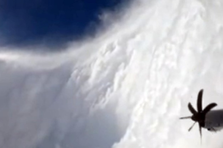 Американски воен авион вчера прелета низ окото на ураганот за да собере метеоролошки податоци. Окото на ураганот е централниот дел од бурата и област на релативен мир и спокојство во рамките на многу насилен систем. Окото е опкружено со таканаречениот ѕид на окото, што е најопасниот дел од ураганот со најсилни ветрови.