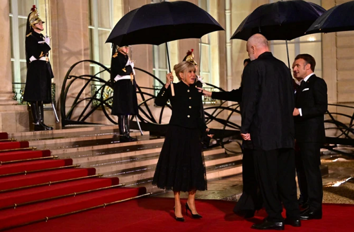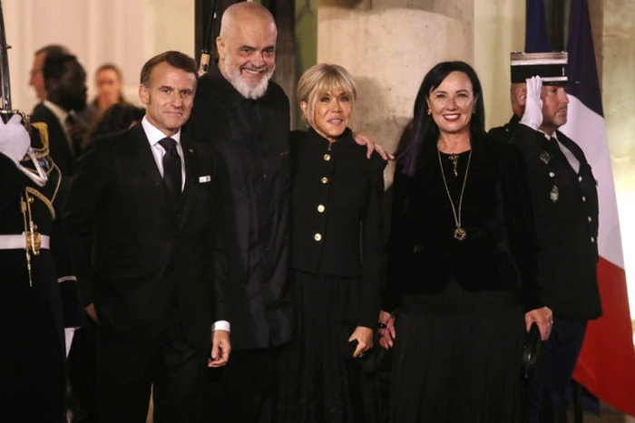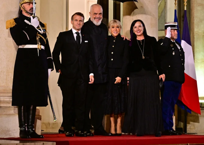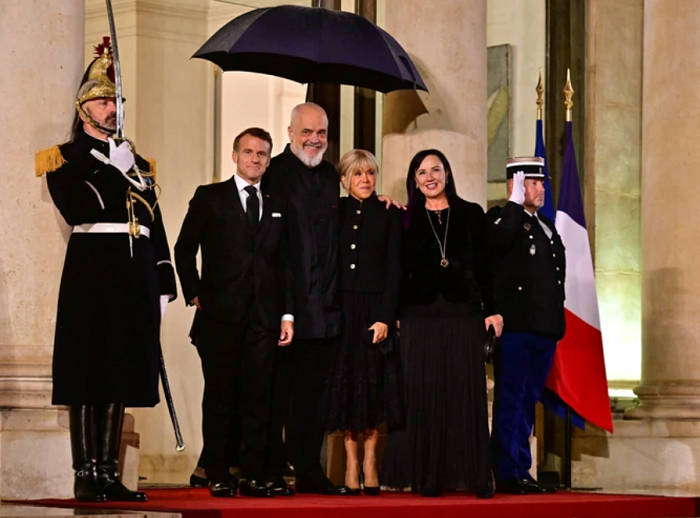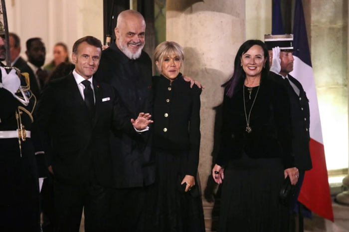 Брижит Макрон и Емануел Макрон ги пречекале гостите од Албанија пред Елисејската палата. Еди Рама се појавил во својот препознатлив стил, а за време на позирањето пред вратите на резиденцијата ја прегрнал првата дама на Франција.