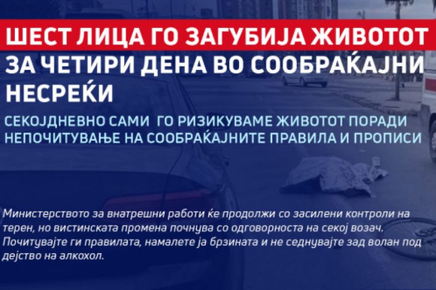 Министерството за внатрешни работи, како што е нагласено во соопштението, ќе продолжи со засилени контроли на терен, но вистинската промена почнува со одговорноста на секој возач. „Почитувајте ги правилата, намалете ја брзината и не седнувајте зад волан под дејство на алкохол. Да возиме со ум, не со емоции. Да не дозволиме нашето невнимание да биде причината некој да не се врати дома“.