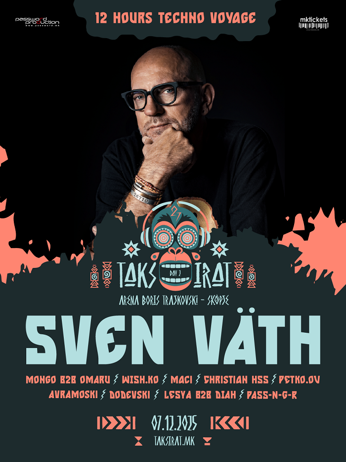 На 7 декември во Арена „Борис Трајковски”, ќе настапи еден од хедлајнерите на годинашниот Таксират, SVEN VӒTH – живата легенда што ги постави техно темелите на глобалната сцена, музички пионер, визионер и култен уметник кој сѐ уште го диктира пулсот на водечките светски подиуми.