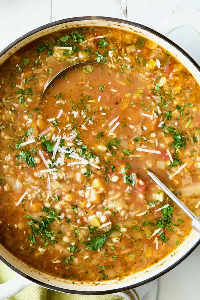 Покријте и оставете ја супата да отстои околу дваесет минути за да се спојат вкусовите и малку да се згуснат. Сервирајте ја топла, наросена со свежо рендан пармезан и сечкан магдонос.