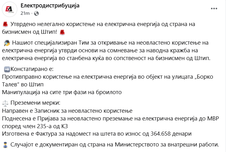 Од таму додаваат дека е направен записник за неовластено користење и дека е поднесена Пријава за неовластено преземање на електрична енергија до МВР според член 235-а од КЗ, како и дека е изготвена фактура за надомест на штета во износ од 364.658 денари.