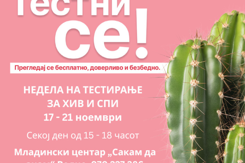 Во рамки на Европската есенска недела на ХИВ и СПИ тестирање, ХЕРА – Асоцијација за здравствена едукација и истражување ги повикува сите граѓани на бесплатно и доверливо тестирање за ХИВ и сексуално преносливи инфекции (СПИ), кое се спроведува во Младинскиот центар „Сакам да знам“ на Водно, од 17 до 21 ноември, секој ден од 15.00 до 18.00 часот.