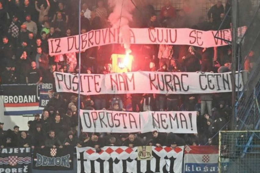 Имаше и транспаренти, па „Торцида“ постави еден со натпис „Се слушаат вресоци од Дубровник, пу..те к.р четници, нема прошка“.