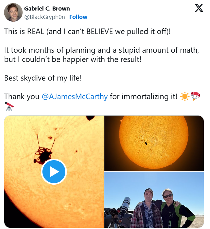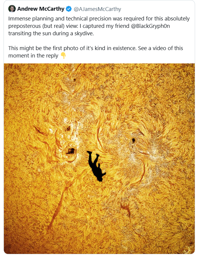 Фотографијата е направена за време на првиот и единствен скок на денот, додаде Мекарти. Сепак, и покрај неделите внимателно планирање, беа потребни шест обиди за правилно усогласување на вселенското летало со Сонцето. Можете да го видите точниот момент на скокот на Кларк во видеото што Мекарти го објави на Икс.