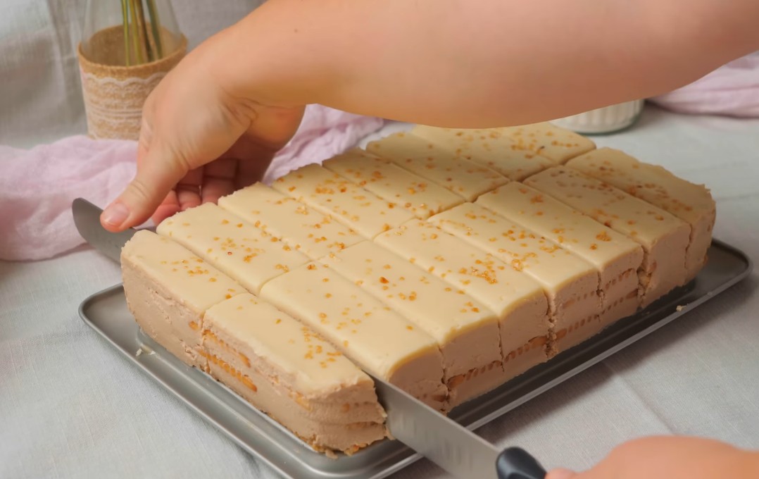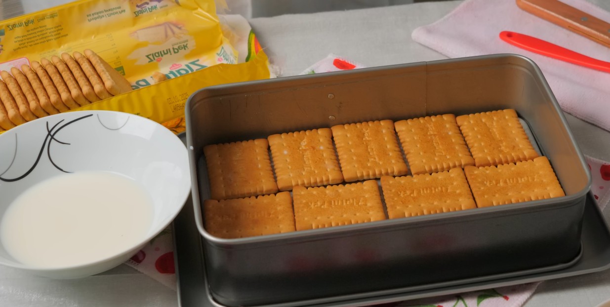 Во помал плех (30 × 20 см), ставете го првиот слој бисквити, претходно потопени во млеко или сок.