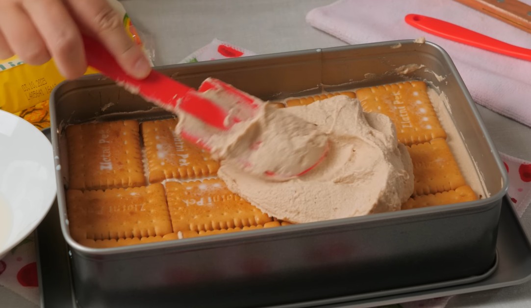 Повторете го процесот: слој бисквити, слој крем, трет слој бисквити и последен слој крем.