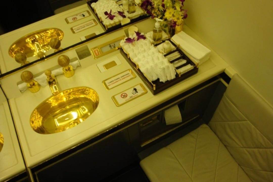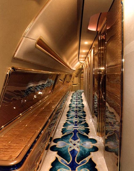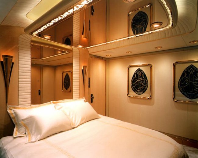 Многу луѓе го нарекуваат авионот „летечка палата“, и тоа не е без причина. Кабината е украсена со позлатени детали, тоалетите наводно имаат мијалници изработени од вистинско злато, ѕидовите имаат специјални кристални и дрвени интарзии, а дневниот престој и просторот за состаноци изгледаат како да се подигнати во воздух директно од луксузна палата.