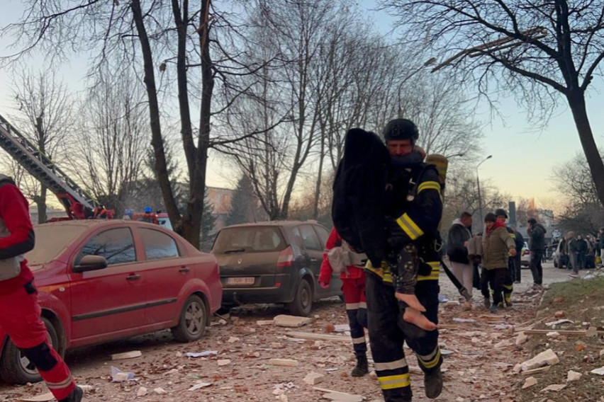 Фотографиите објавени од Државната служба за вонредни состојби на Украина покажуваат излози на продавници и станбени згради разнесени во нападот, а спасувачите ги превезуваат повредените жители покрај уништени автомобили.