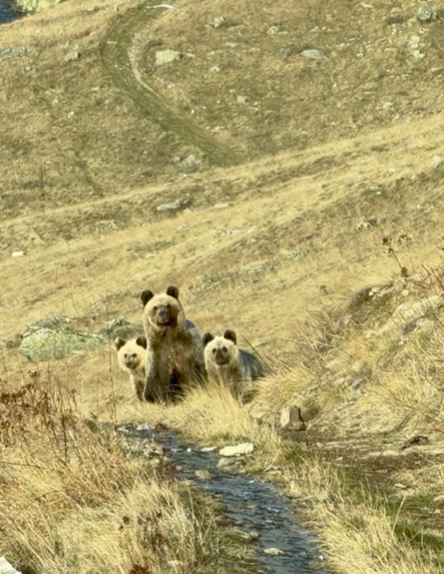 „Во видеото што го споделуваме, планинари на високопланинските пасишта среќаваат мечка со две мечиња, родени во јануари–февруари 2025 година. Малечките во следните две години ќе учат од својата мајка како да преживуваат и се приспособуваат во дивината. Во видеото тие се љубопитни, но се оддалечуваат од луѓето, избегнуваат средба – типично однесување за мечки.