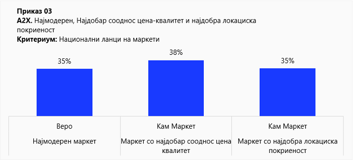 Според добиените податоци Веро е најмодерен маркет во Македонија според 35% (зголемување од 4% во однос на претходното истражување) од потрошувачите. Најдобар сооднос помеѓу цената и квалитетот на производите има Кам Маркет според 38% од потрошувачите и истиот маркет има најдобра локациска покриеност со 35% учество.