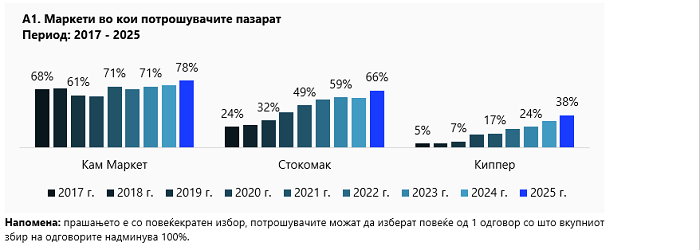 Стокомак го зголемува учеството на 66% во овогодинешното истражување, во споредба со 58% претходната година, што укажува дека значително се зголемил бројот на потрошувачи кои пазарат во тој ланец на маркети. Најголем раст на учеството е забележливо кај Киппер, кој од 5% на 38% учество помеѓу 2017-та и 2025-та година. Иако има пониско учество споредбено со КАМ Маркет и Стокомак, се позиционира на третата позиција и се очекува во следните години да ја зајакне истата. Растот на Киппер се темели на големото проширување на малопродажната мрежа, не само како физички локации туку и региони во последните неколку години. Таквата стратегија според резултатите придонела за Киппер да е место за пазарење на се поголем број на потрошувачи. Дополнителното ширење во 2024 и 2025-та година ќе придонесе за зголемување на базата на потрошувачи а со тоа и унапредување на позицијата.