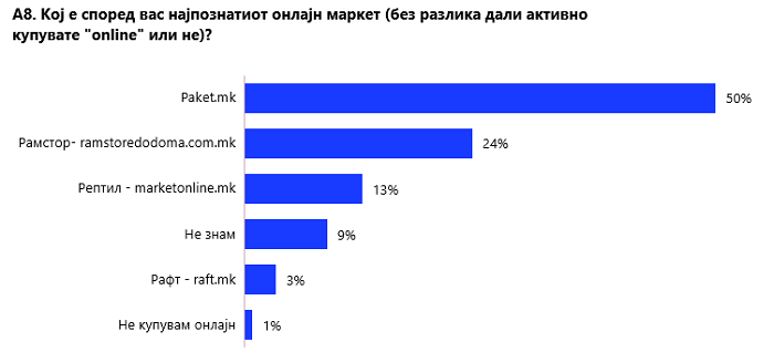 Како најпозната е-продавница според потрошувачите во Македонија е Paket.mk за 50% од потрошувачите, потоа Рамстор – ramstoredodoma.com.mk за 24% и на третата позиција е Рептил со 13%. Тоа што е од важност е дека купувањето на прехранбени производи преку интернет е сеуште во зачеток во Македонија. Од анализата на категориите кои што потрошувачите би ги купиле или не преку интернет, укажува на голема скептичност за купување голем број на категории на производи. Сепак, развојот е неминовен и компаниите се повеќе ќе пронаоѓаат начини за надминување на бариерите.
