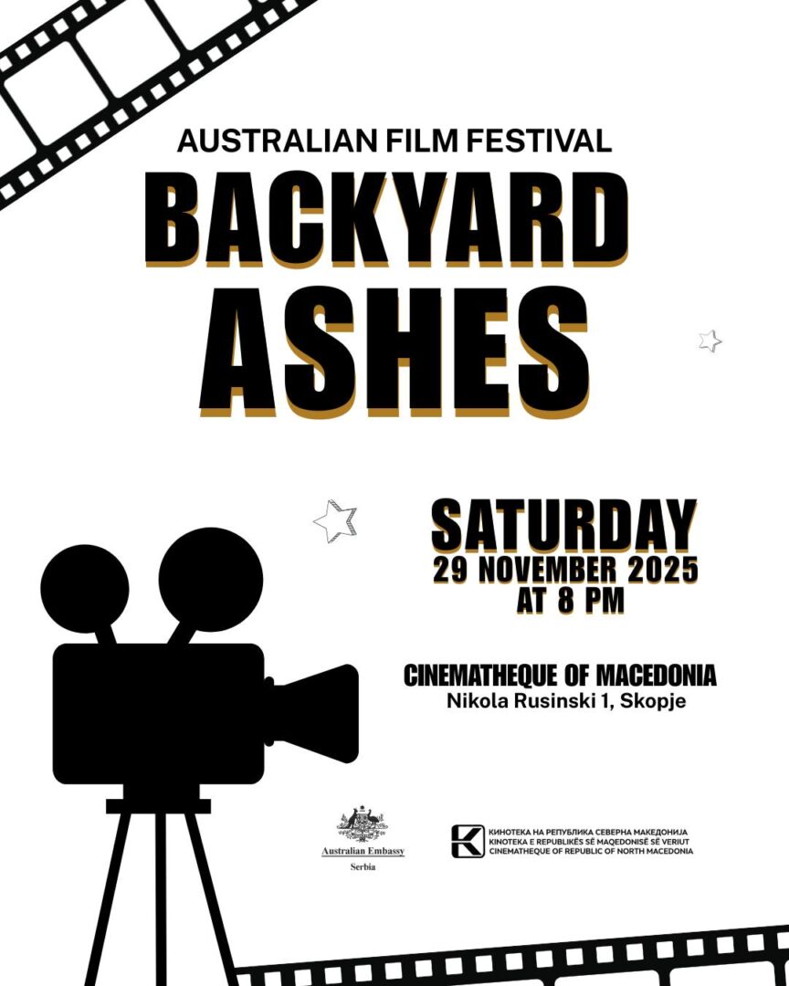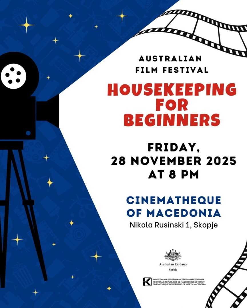 Во петок, 28-ми ноември, со почетокот во 20:00 часот, ќе биде прикажан австралискиот филм „Домаќинство за почетници“ (Housekeeping for Beginners) на истакнатиот македонско-австралиски филмски режисер Горан Столевски, а во сабота, 29-ти ноември, публиката во Кинотека ќе има можност да ужива во комедијата „Дворска пепел“ (Backyard Ashes) и да дознае повеќе за тоа колку крикетот им значи на Австралијците.