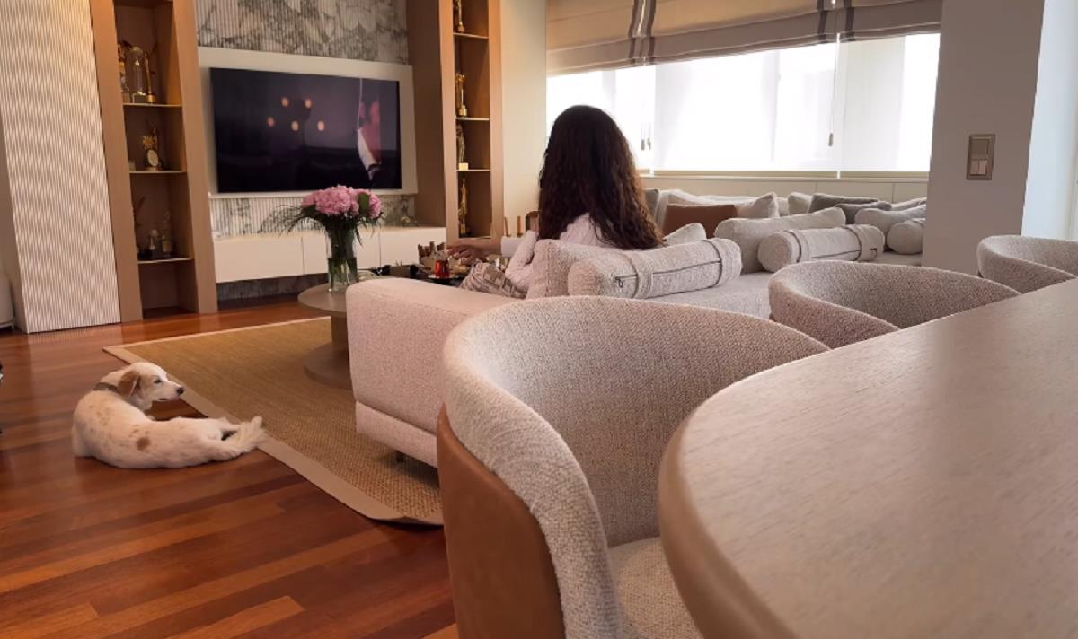 Таа избрала едноставен мебел којшто е удобен. Станот е многу добро осветлен, а ѕидовите во сите простории се целосно бели, баш како и полиците. На видеото можело да се види и нивното куче.