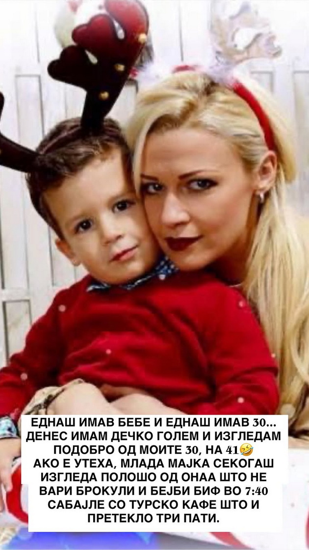 „Еднаш имав бебе и еднаш имав 30... Денес имам дечко голем и изгледам подобро од моите 30, на 41. Ако е утеха, млада мајка секогаш изгледа полошо од онаа што не вари брокули и бејби биф во 7:40 сабајле, со турско кафе што ѝ претекло трипати“, напиша таа.