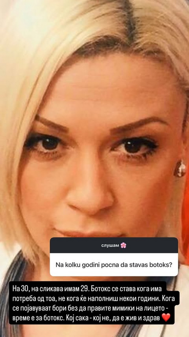 „Кога се појавуваат брчки без да правите мимики на лицето, тогаш е време за ботокс. Кој сака – кој не, да е жив и здрав!“, напиша таа во една прилика.