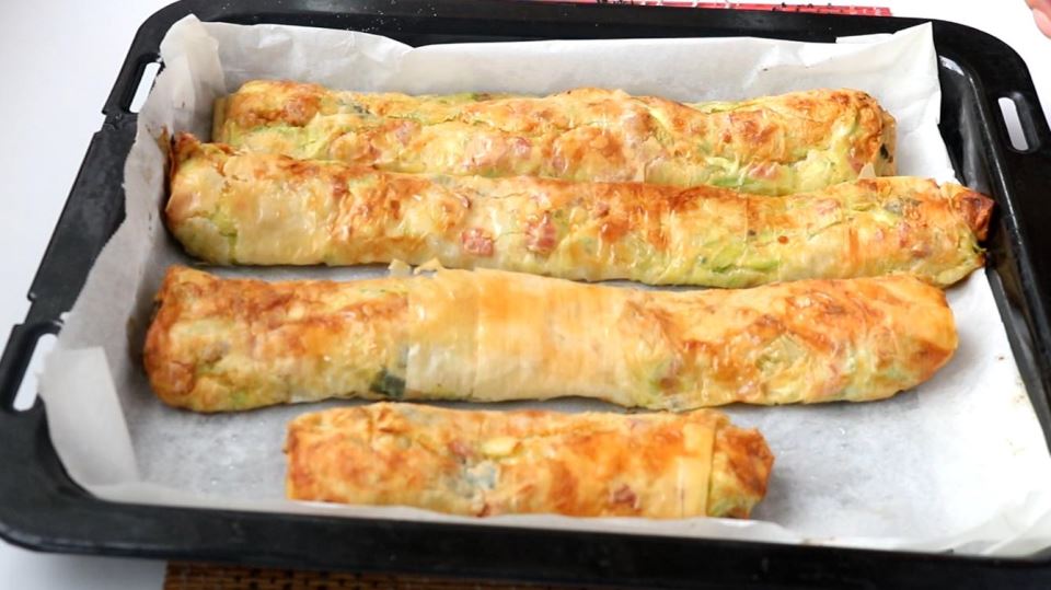 По желба, пред крај додајте ситно сечкан лук. Корите за пита напрскајте ги со вода, распоредете го филот и виткајте во ролати, па наредете ги во плех малку напрскан со вода.