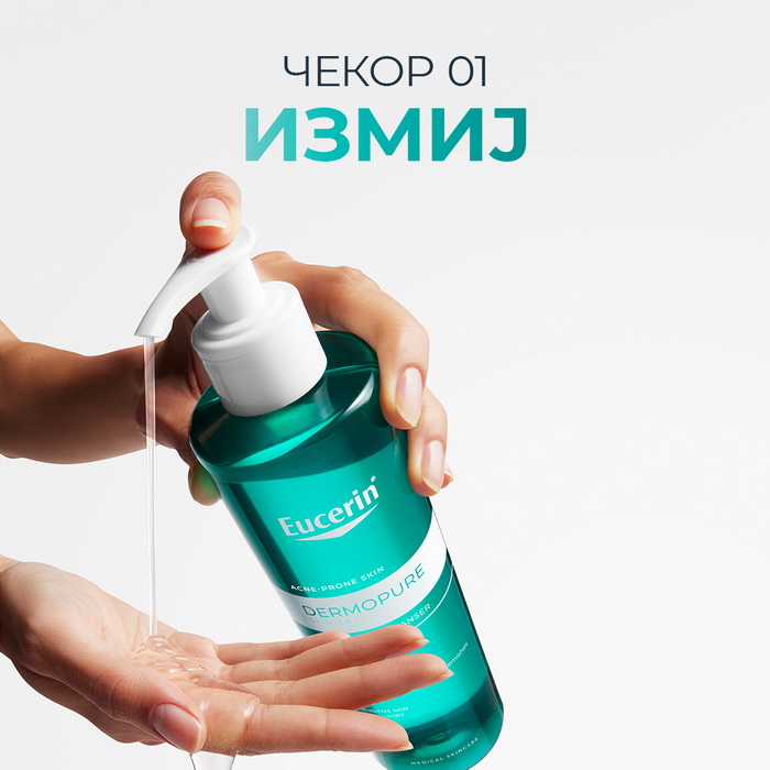 • Чекор 1: Чистење со Eucerin DERMOPURE CLINICAL гелот за миење лице