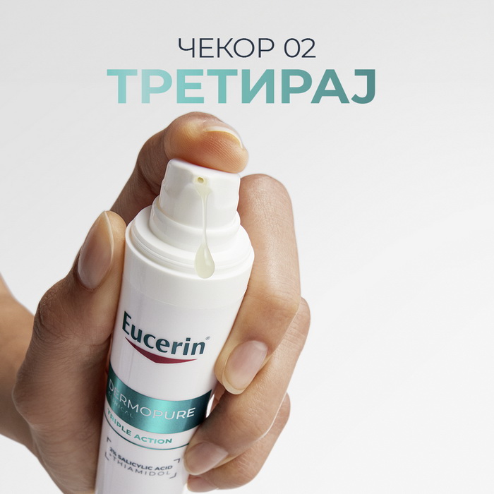 Секое утро, измијте го вашето лице со Eucerin DERMOPURE CLINICAL гелот, за длабинско и нежно чистење на кожата. Ги корегира дамките уште при првото користење, благодарение на минималистичка формула која е без мирис и сапун и содржи само 8 состојки, вклучувајќи салицилна киселина (BHA) за чистење на порите на кожата без сушење.