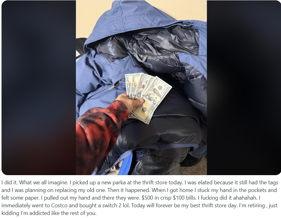 „Ја ставив раката во џебот и допрев пари. Извлекол однатре околу 500 долари“, напишал тој возбудено поради тоа што не очекувал да најде мало богатство: „Ова е најдобриот лов на „second hand“ некогаш“, заклучил тој.